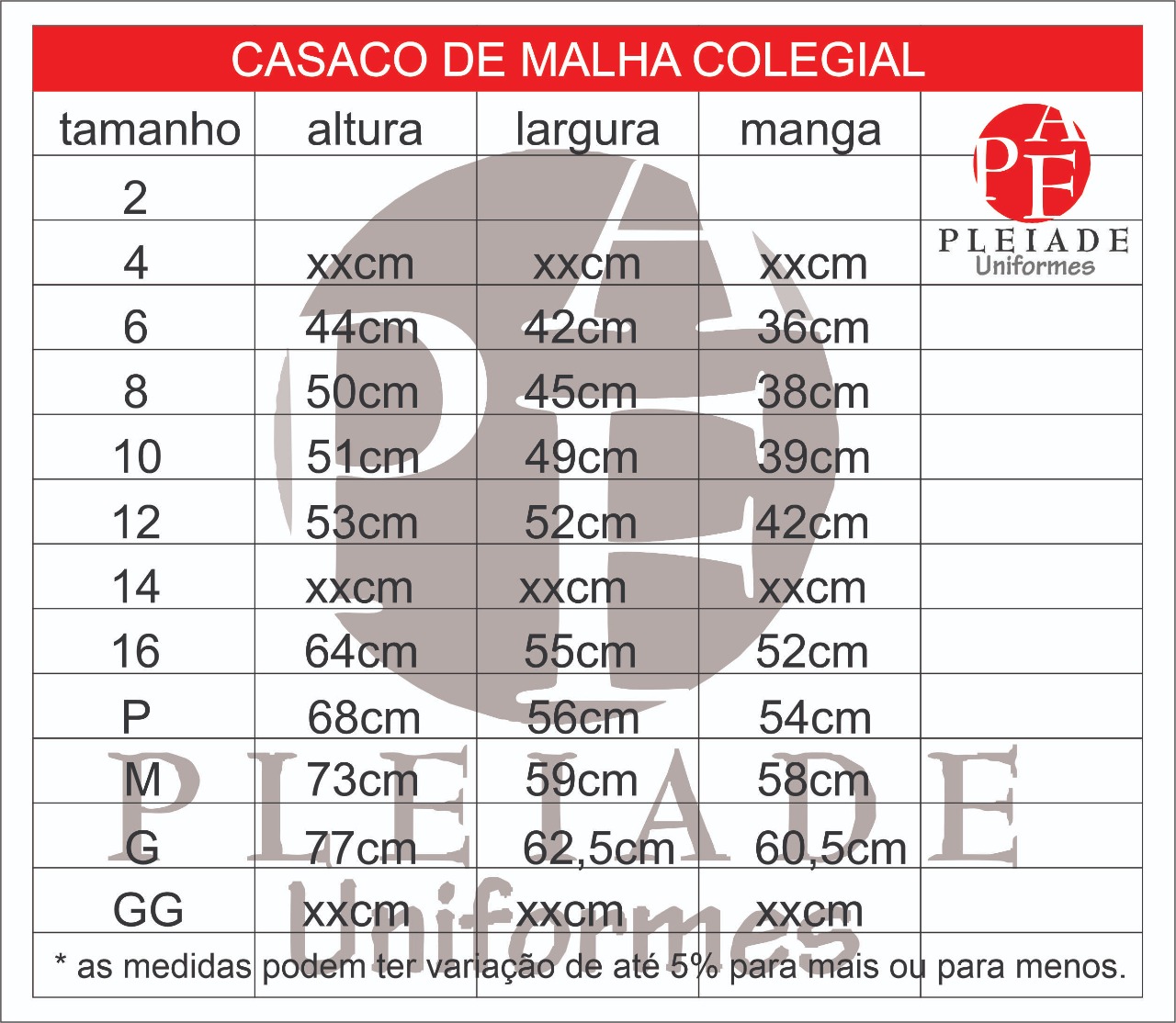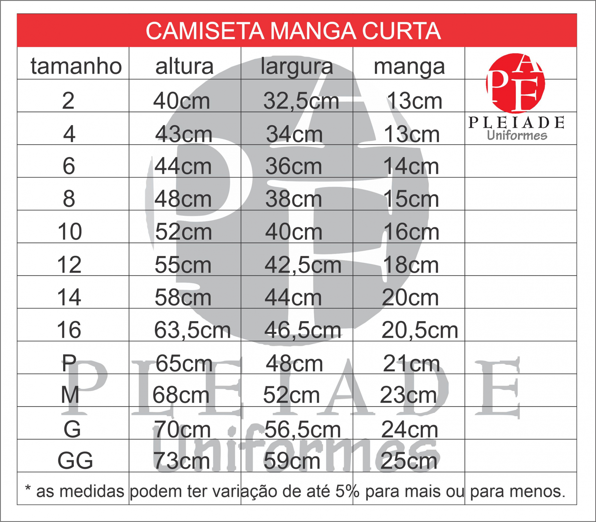 Tamanhos P, M, G, GG, XG