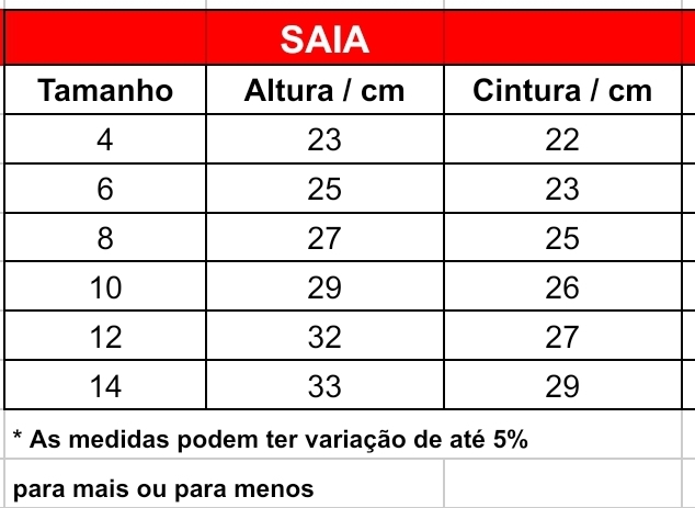 Tamanhos 04 ao 14